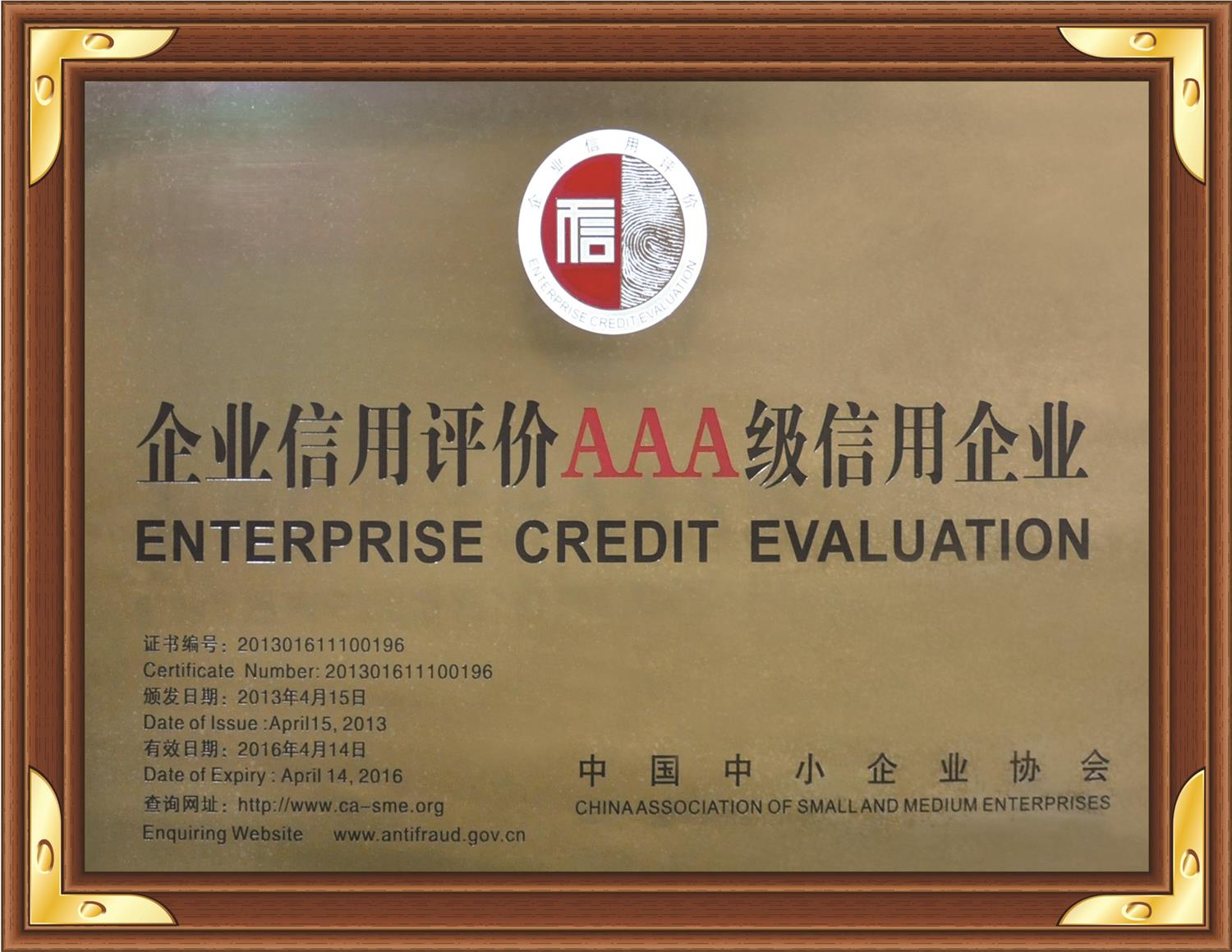 获得中国中小企业协会及商务部“诚信AAA”认证并取得证书